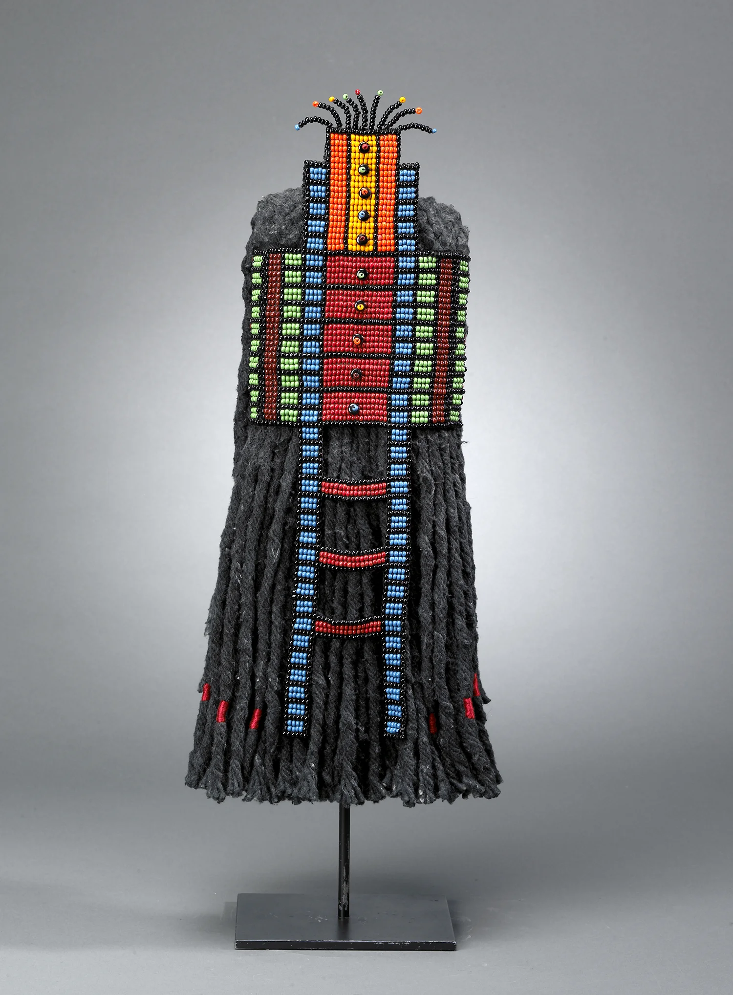 One day, I was preparing to cut up a kitchen mop head to use as a cellulose fiber and put into my paper beater for pulp. I placed it on a hook as I went to get my scissors, and was struck by how much it resembled the beautiful masks/headdresses from Papua New Guinea I’ve admired at the Metropolitan Museum’s Rockefeller Collection.